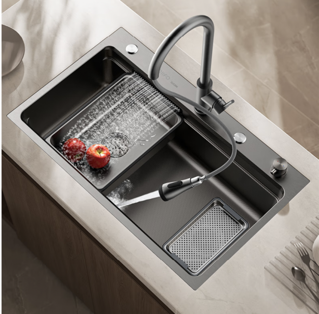 正在日丰卫浴工场,“日丰瀑布水槽”正络绎不绝下线。这款由京东取日丰结合打制的爆款单品,已成为国货水槽的标杆之做。产物采用双导轨设想,实现洗、切、沥一体化操做;概况使用纳米涂层手艺,无效抵御剐蹭划痕,兼顾适用取美妙。